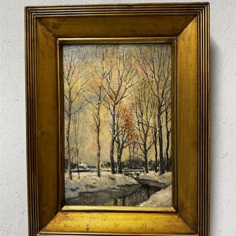 Öljyvärimaalaus kovapinnalle, jossa on talvinen maisema. Takana leima, joka viittaa, että teos Unkarilainen. Kehyksissä on koristeellisia yksityiskohtia ja kultainen sävy.