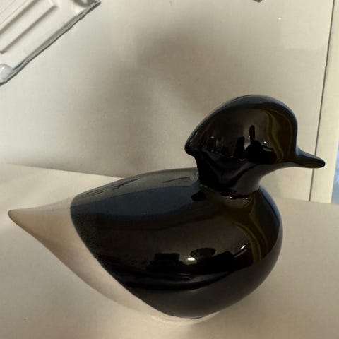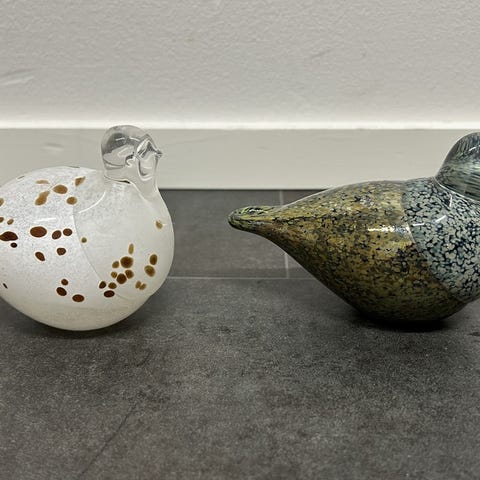 Kaksi lintua, joista toinen on lasinen ja toinen keraaminen. Lasinen lintu on osittain läpinäkyvä ja siinä on metallinhohtoinen pää. Keraaminen lintu on yksivärinen ja mattapintainen.