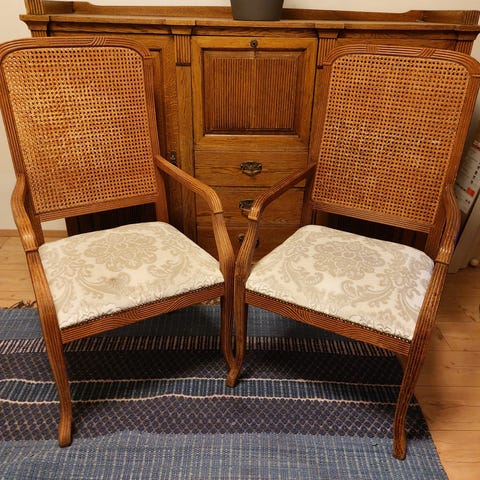 Antiikkiset tuolit ovat arviolta 1800 lukua, joissa verhoilut ja pinnat ehostettu jossain vaiheessa. Punaraidallinen kangas lisää niihin retrohenkistä ilmettä.