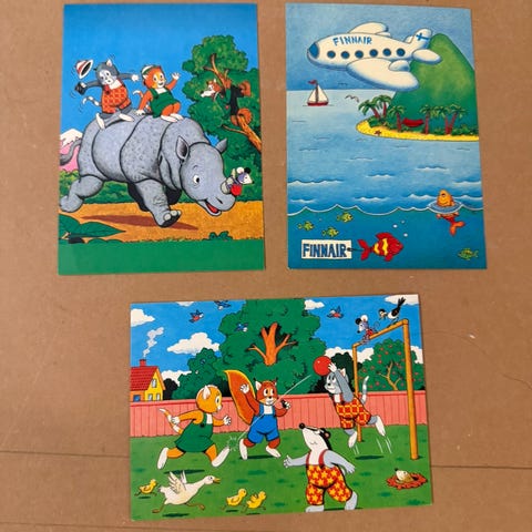 Mukana myös Mika Waltari Sinuhe Egyptiläinen postikortti 100-vuotta syntymästä, sekä Hannu Tainan Uppo Nalle Saunan jälkeen postikortti.