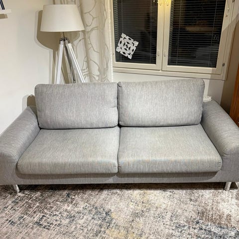 Sohva on siistissä kunnossa, kankaassa on hieman pesemällä irti lähteviä käytön jälkiä. Sohvassa ei ole eläinten karvoja tms.