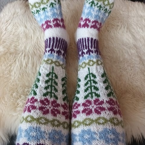 Novita & Arabia yhteistyömalliston käsinneulotut design villasukat, "Pomona ". Lankana Novita 7-veljestä ja Nalle. Oikein pitkävartiset, varren pituus kantapäähän saakka n.53 cm, jalkaterän pituus n.26 cm. Sopivat 40-41 (42) kokoiseen jalkaan.