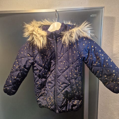 Tummansininen H&M talvitakki, koko 104. Irroitettava huppu karvareunuksella, vyötäröllä kiristysmahdollisuus. Käytetty kauppatakkina.