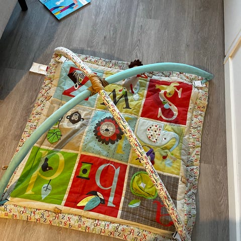 Vauvan helistin, muovinen, sininen ja keltainen väri.