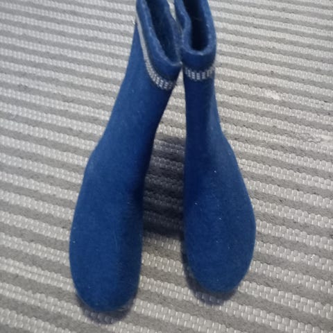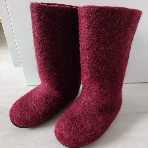 Huopikkaat punaiset, koko arviolta 28/ sisämitta kenkämitalla 18,3 cm. Ei kumipohjaa, voi pohjata itse/suutarilla jos sitä kaipaa. Pohja ehjä, mutta vasemmassa huopikkaassa on huopa mytyllä jalan alla ja tuntuu ja näkyy sisälle, ks. kuva. En muista että olisi lapset valittaneet, sisällä on käytetty pohjallisia tasoittamaan sisäpohjaa.