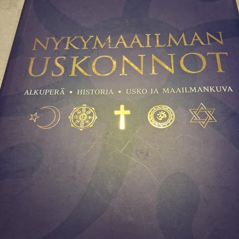 Kattava teos 220 s. maailman uskonnoista. Kirjassa joitakin lyijykynällä tehtyjä alleviivauksia.
