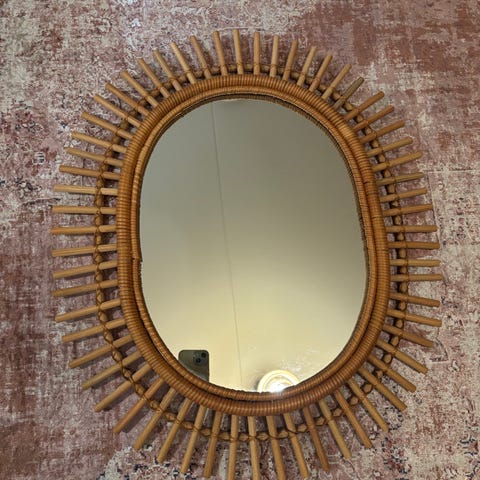 Myydään rottinkinen aurinko seinäpeili ”Stenen”. Kunto uudenveroinen. Ulkomitat 76cm, peilin koko 38cm.
