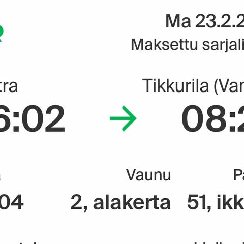 VR IC 8 junalippu Lappeenranta - Helsinki matkalle. Lippu on lapselle, vaunu 6. alakerrassa, paikka 23 ikkunan vieressä. Matkustuspäivä 23.1.2026, lähtö klo 14:36 Lappeenrannasta, saapuminen klo 16:44 Helsinkiin. Lisäpalveluita ei ole.