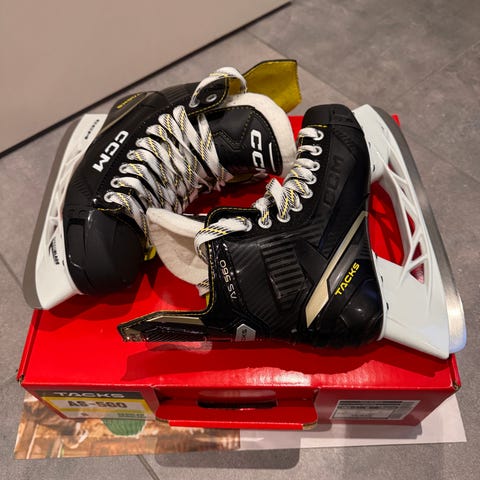 Myydään CCM Super Tacks 9355 luistimet koossa 40,5. Luistimet ovat olleet yhdellä lapsella käytössä muutaman kerran koulun luistelussa, jonka jälkeen jäivät pieniksi. Luistimissa on vähäisiä naarmuja, mutta näyttävät edelleen hyvin siisteiltä. Terät ovat edelleen uudenveroisessa kunnossa ja terävinä käyttöä varten. Lesti on kapea D-mallinen.