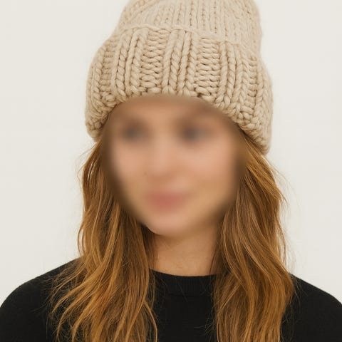 Ruskea pipo, jossa vaaleanpunaiset kuviot. Kaksinkertainen neulos, joten pipo on lämmin.