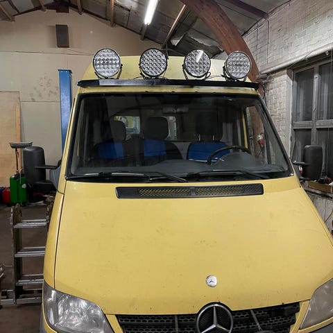 IP68-luokitellut LED-lisäävalot, 2 kappaletta. Valaisimissa on kestävä musta runko ja ne on suunniteltu kestämään vaativia olosuhteita. Sopivat erilaisiin työ- ja ajoneuvokäyttöihin, joissa tarvitaan tehokasta ja pitkäikäistä valaistusta. Valot oliva kiinni Sprintterin edessä.