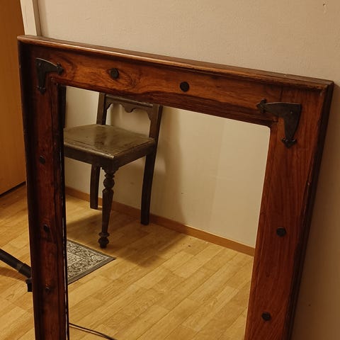 Akaasia peili, erinomainen kunnossa. Sopii ripustettavaksi sekä pystysuoraan että vaakasuoraan. Yksi pieni musta jälki peilissä, lähes huomaamaton. 132x42cm