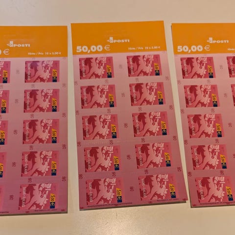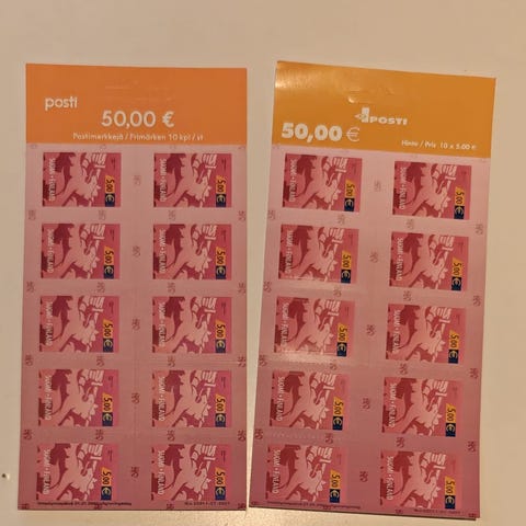 Käyttämättömiä postimerkkejä 2arkkia eli 20kpl, postilta ostettuna 27e/kpl, nyt minulta 2 arkkia 35e