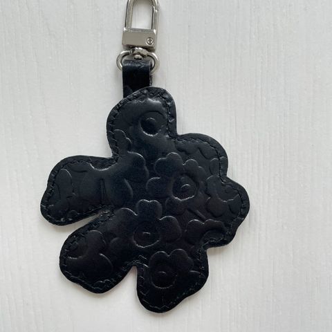avaimenperässä on tupla Unikko-kukka, Marimekko-laatta, avainrengas sekä klipsi