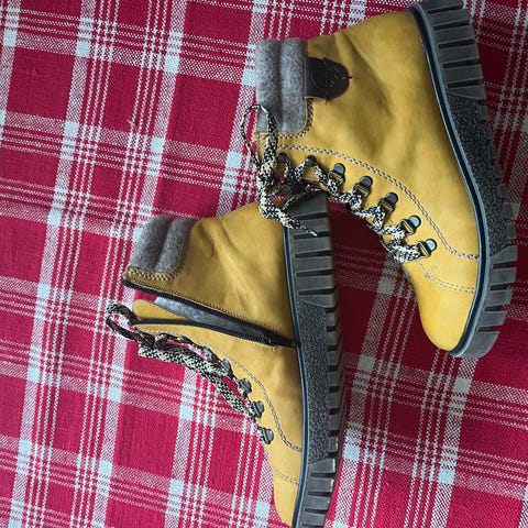 Käyttämättömät Riekerin nilkkapituiset talvikengät, joissa on koristeellinen nauha yksityiskohtana. Sivuissa vetoketju. Lämmin vuori ja pohjallinen.