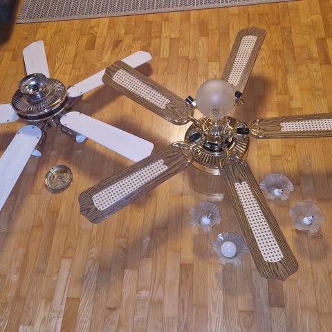Myydään kuvan kattotuuletin. Lavat maalattu mustaksi. Testattu toimivaksi