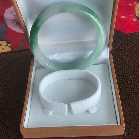 Lahjaksi saatu, käyttämätön Jade rannekoru rasiassaan