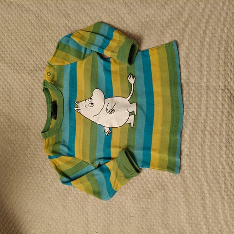 Muumi paita, vähälle käytölle jäänyt. Mielestäni hieman pientä kokoa. Olis voinu ottaa jo aikaisemmin käyttöön, kun koossa 86/90.