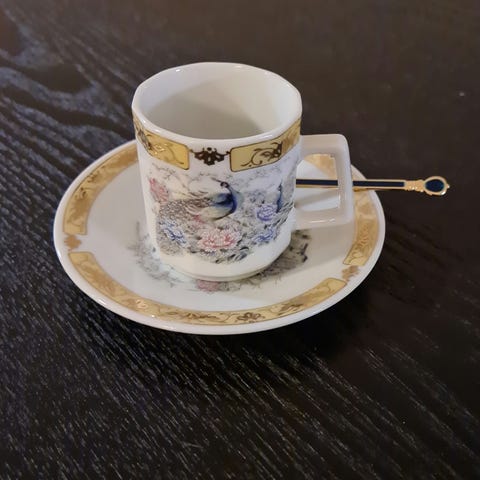Hyvä kuntoinen vintage mokkakahviastiasto, yhdestä kupista korva rikki.