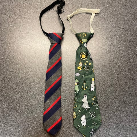 Musta solmio hieman kiiltäväpintainen ja tarrakiinnitys. Solmion pituus 25 cm. Kaulan ympäri menevä lenksu pituudeltaan 38,5cm. Ei säätömahdollisuutta, kangas ei jousta.
