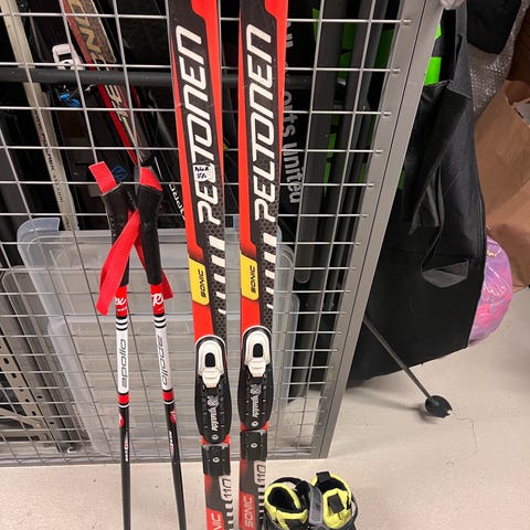 Suksien merkki Peltonen ja sauvat sekä monot Fischer.