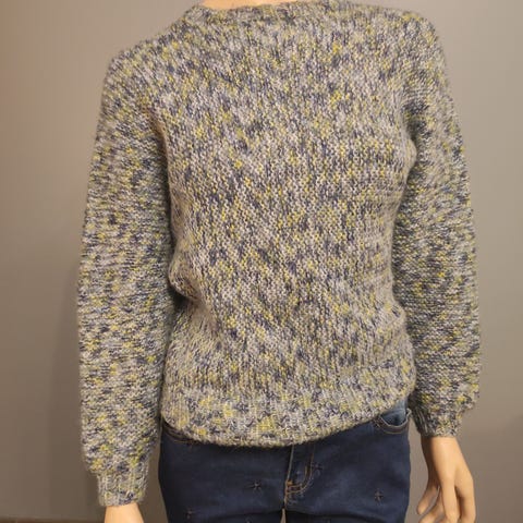 Kuviollinen villapusero. Puseron pituus n.72 cm, kainaloiden alta mitattuna leveys n. 56 cm, hihan pituus kainalosta n. 46 cm ja olkapäältä n. 50 cm. Villapaidassa ei ole mitään lappuja, joten lienee itsetehty. Eläimetön ja tupakoimaton talous.