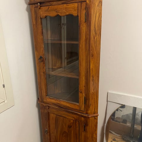 Maalattu Tikkurilan mulperi -sävyllä. Mukaan saa kahdet nupit/vetimet. Toiset valkoiset (4kpl) ja tummat (4kpl). Kaapissa on lasiovet yläosassa ja umpinaiset ovet alaosassa.