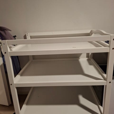 Myydään valkoinen JLY Dream Lux hoitopöytä. Kaksi hyllyä ja laatikko, joissa hyvin säilytystilaa.