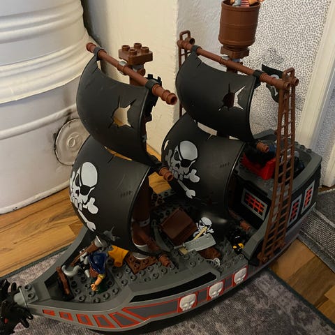 Huikea Lego Duplo merirosvolaiva, jossa mukana läjäpäin ukkoja, apina, aseita, aarre, pommeja, lippu, ankkuri yms.