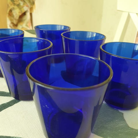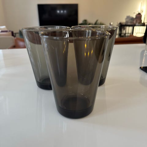 Iittalan valmistamat ja Kaj Franckin suunnittelemat isot Kartio -lasit, vetoisuus 0,4 l. Väri on vaihtoväri eli ns. väliväri, tässä tapauksessa siniharmaa. Korkeus 12,5 cm, suuaukon halkaisija 8,5 cm. Lasit ovat käyttämättömät.