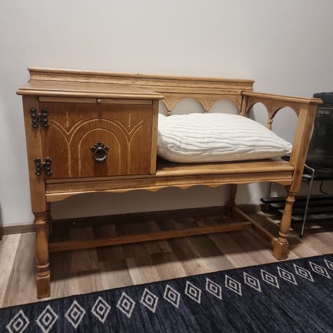 Hyväkuntoinen kotimainen mustaksi petsattu mänty penkki on kätevä kylpyhuoneen istuimena ja laskutilana. Penkkiä voi käyttää myös katetulla terassilla ja eteispenkkinä.