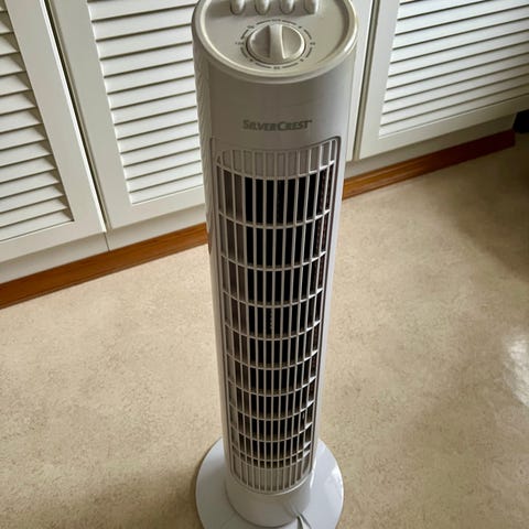 Rowenta Tower tyyppinen pylvästuuletin, valkoinen. Tuuletin on varustettu säädettävillä nopeuksilla. Välillä pyöriessään pitää natisevaa ääntä, voi käyttää myös ilman
