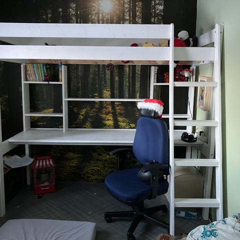 Myyfään kuvan mukainen kaunis kuultovalkea massiivipuinen parvisänky, johon mukaan kuuluu ulosvedettävä työpöytä. Ei tarvise kiinnittää seinään. Patja ei kuulu kauppaan. Ollut vähäisellä käytöllä muutaman vuoden. Kunto on hyvä tietysti pientä käytön jälkeä löytyy.