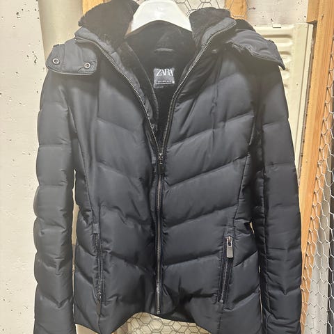 DKNY Talvitakki ruskeana, naisten kokona M. Takki on suunniteltu talvikäyttöön, materiaali sisältää pehmeää ja lämpöä eristävää kangasta. Malli sisältää hupun ja vetoketjullisen etuosan.