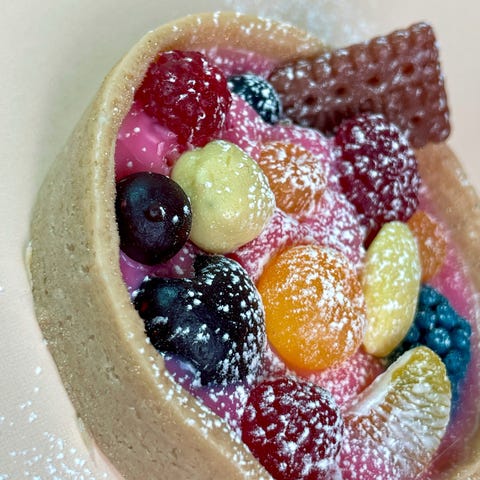 Iso käsintehty saippua “kermakossa” (n. 120 g) hedelmäkoristeilla. Saatavilla eri väreissä. Tuoksut: leivonnaiset, manteli ja hedelmät.