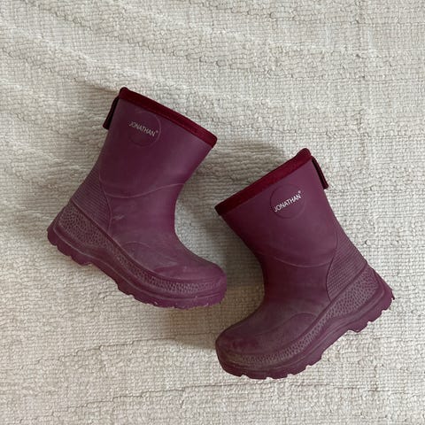 Vettä pitävät kumisaappaat, joissa ulkopuoli vielä ihan priimaa, mutta sieltä alkaa vähän pohjallinen ja vuori repsottaa.