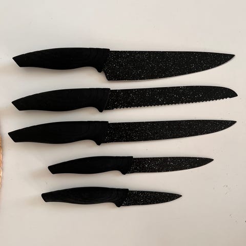 Myydään hyvässä kunnossa oleva keittiöveitsisetti. Sisältää viisi eri kokoista ja eri ruoalle tarkoitettua veistä. Silikoninen varsi. Hp 15e.