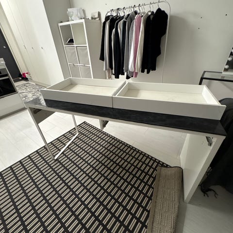 IKEA Thyge työpöytä, valkoinen väri, metalliset säädettävät jalat. Pöytälevyn pinta on valkoinen ja siinä on pieniä käytön jälkiä hiirimatosta ym (en ole kokeillut hangata pois, pyyhitty vain yleispuhdistusaineella). Koko 160x80 cm.