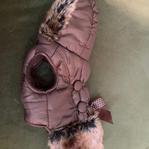 Noox- toppamantteli kääpiökoiralle tai pienelle pennulle. Selän pituus 24cm. Väri hopea, fleece -vuori , helpot tarrakiinnitykset.
