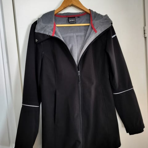 Myydään kevyt softshelltakki. Hupussa ja helmassa kiristysnauhat. Vetoketjutaskut. Väreinä tummansininen ja koralli