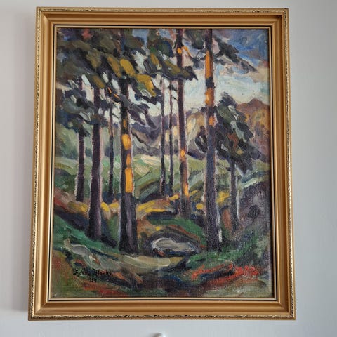 Öljyvärityö hyvässä kunnossa, kehyksestä pieni pala pois, näkyy kuvassa.