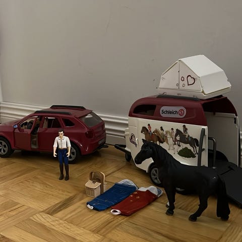 Schleich auto ja hevosenkuljetusvaunu + muuta tavaraa. Yksi ihmishahmo ja riimunaru puuttuu. Muuten hyvässä kunnossa. Nouto etusijalla. Katso muutkin myynnissä olevat Schleich tuotteet.