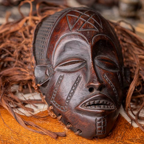 Muuta: Aivan fantastisen upea ja yksityiskohtainen käsin veistetty naamio, jolla on varmasti paljon tarinoita kerrottavanaan. Naamio esittää heimon seremoniallisen hahmon tai esi-isän kasvonpiirteineen ja yleensä tällaisia naamioita käytettiin tansseissa, siirtymäriiteissä ja yhteisön tarinankerronnassa. Luoteisrannikon alkuperäiskansat ovat tunnettuja nimenomaan puuveistotaiteestaan (erityisesti naamioista), jotka kuvastavat usein henkiä, eläinhahmoja tai myyttisiä esi-isiä. Naamioiden käyttö liittyi usein potlatch-seremonioihin, joissa juhlistettiin yhteisön tapahtumia ja siirrettiin sosiaalista asemaa. Sulkapäähine ja kasvojen ilmeikkyys voivat viitata tässä kohtaa soturihahmoon, henkimaailman olentoon tai tarinalliseen esi-isään, joka tapauksessa naamion veistoksen tyyli on selvästi perinteitä kunnioittava.