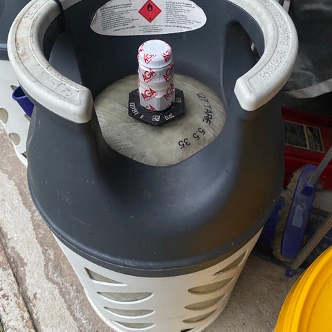 Tyhjä 11 kg painoventtiilipullo noudettavissa, maksu käteisellä tai mobilepay. Pullo käy myös vaihtopullona sivuventtiilipulloon.