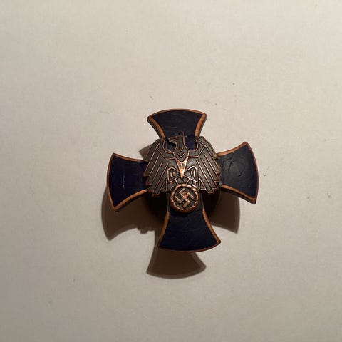 Vanha metallimerkki, jossa teksti “Front Heil” ja aikakauden symboliikka.