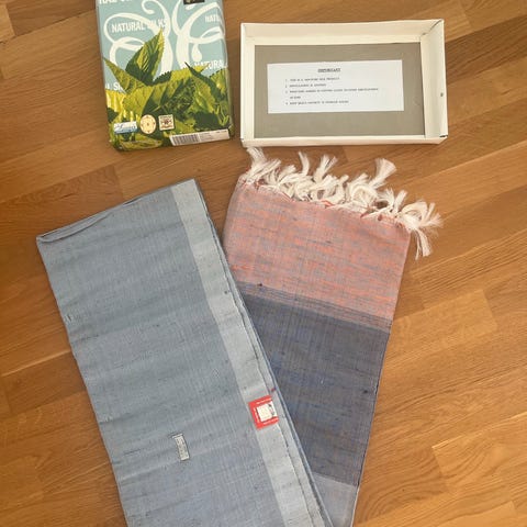 Sievä intialainen kantha-huivi, toinen puoli vaalea ja toinen tumma. 48 x 194 cm.