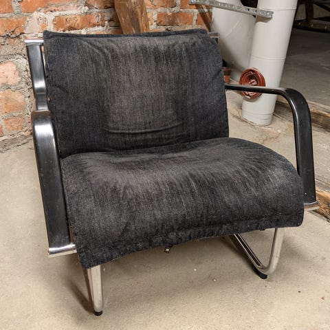Yrjö Kukkapuron remmi-nojatuoli, mustaa nahkaa. Kunto hyvä, lukuunottamatta pientä paikattavissa olevaa kulmaa (jota ei käytössä huomaa).