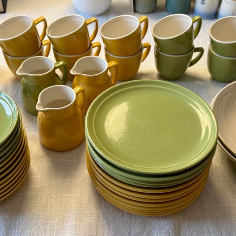 Myydään vähälle käytölle jääneitä, hyvä kuntoisia kermansaven astioita. Värinä vihreä sekä kermanvaalea.