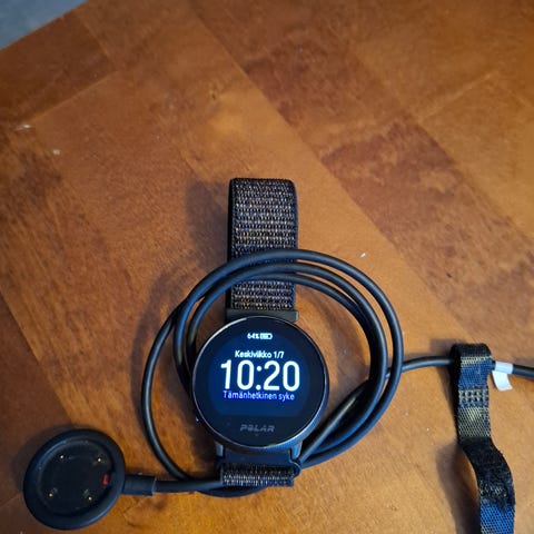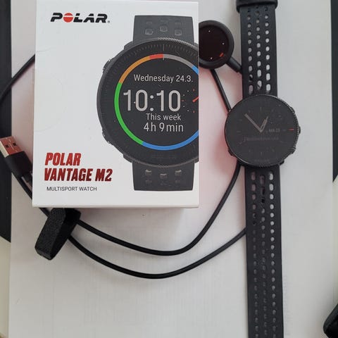 Polar Vantage M musta urheilukello ja USB latauskaapeli. Kello on ollut kohtuullisen kovassa käytössä. Rannekkeesta puuttuu rengas, joka pitää rannekkeen ylijäävän remmin roikkumasta. Tuohon voi kai keksiä jotain DIY ratkaisua.