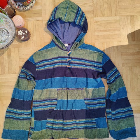 Farkku-college -hupparitakki, jonka selässä susiaiheinen kuva. Koko M. Tuote käyttämätön.